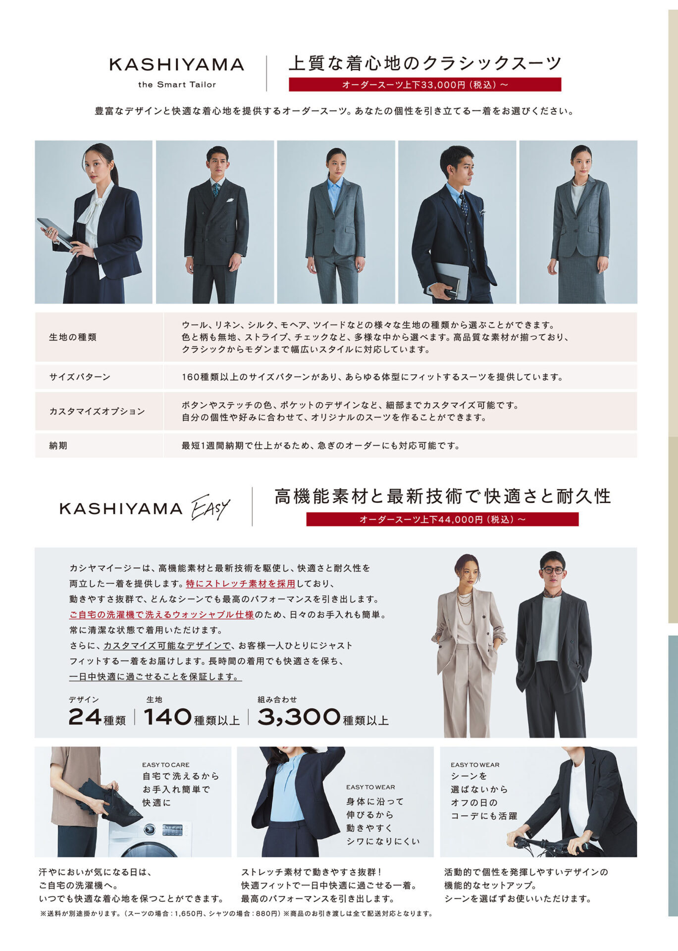 上質な着心地のクラシックスーツから、高機能素材と最新技術で快適さと耐久性を兼ね揃えるKASHIYAMA Easy、法人向けオーダーユニフォームまで、さまざまなラインナップをご用意。